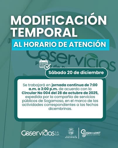 Informamos a toda la comunidad que este sábado 20 de diciembre tendremos atención al público de 7:00 a.m. a 3:00 p.m. en jornada continua.