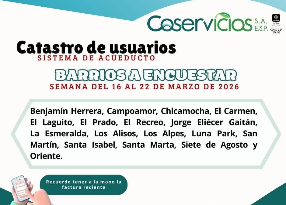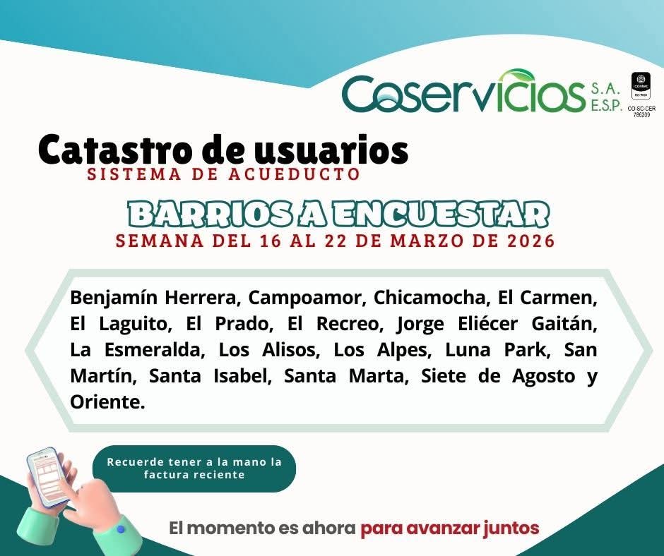 Coservicios S.A. ESP informa que del 16 al 22 de marzo continuarán las visitas en los siguientes barrios de Sogamoso: Benjamín Herrera, Campoamor, Chicamocha, El Carmen, El Laguito, El Prado, El Recreo, Jorge Eliécer Gaitán, La Esmeralda, Los Alisos, Los Alpes, Luna Park, San Martín, Santa Isabel, Santa Marta, Siete de Agosto y Oriente.